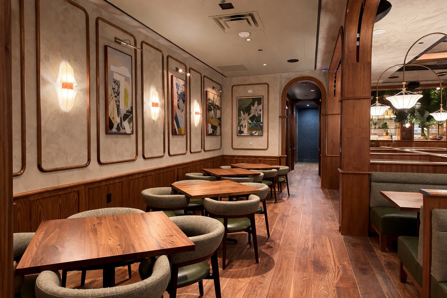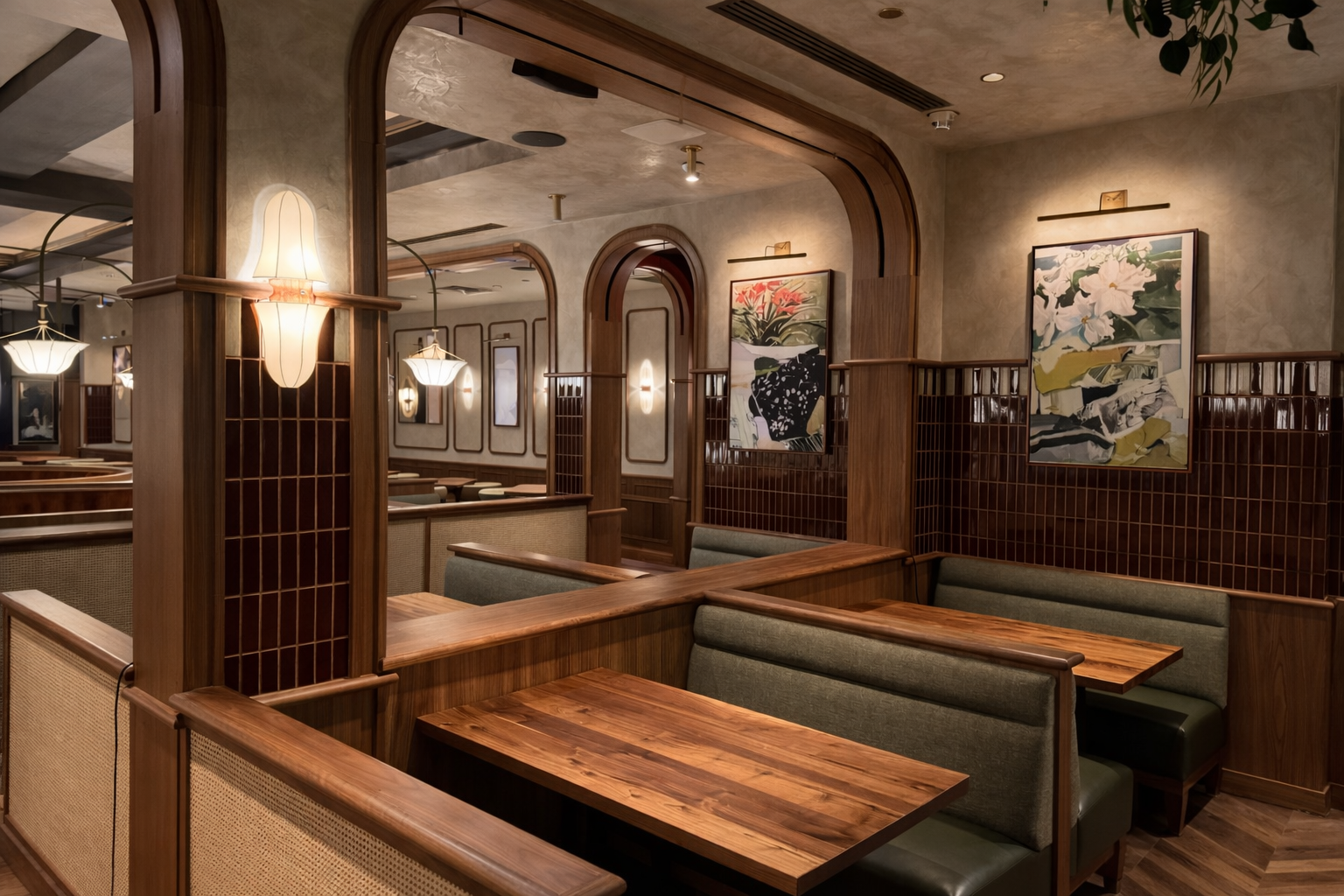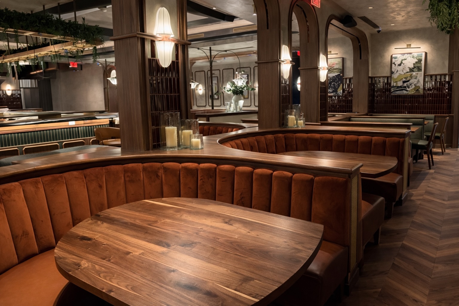 Complete fabrication and installation of custom banquettes, bar shelving, architectural wood elements, and aluminum panels with wood-finished surfaces.
