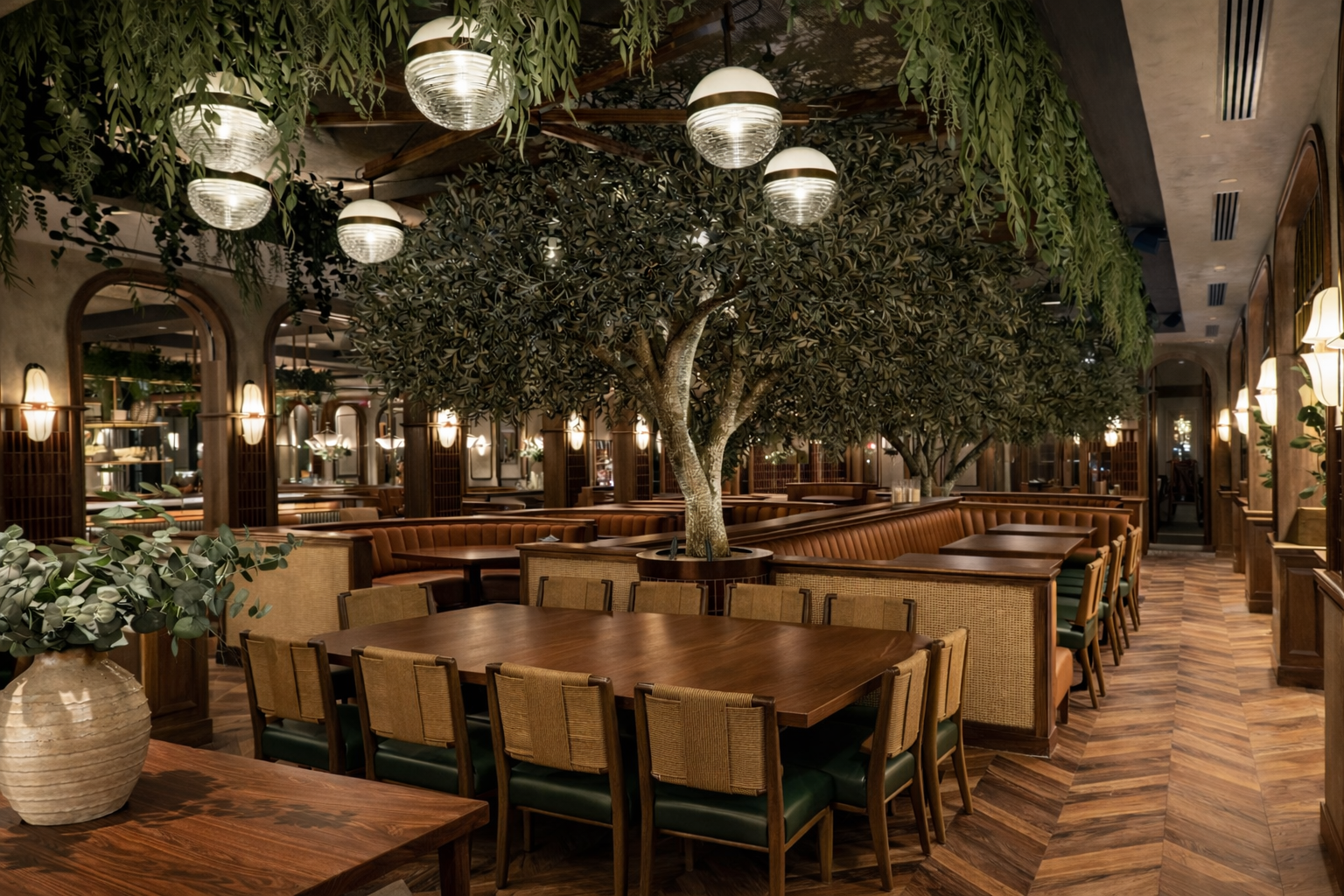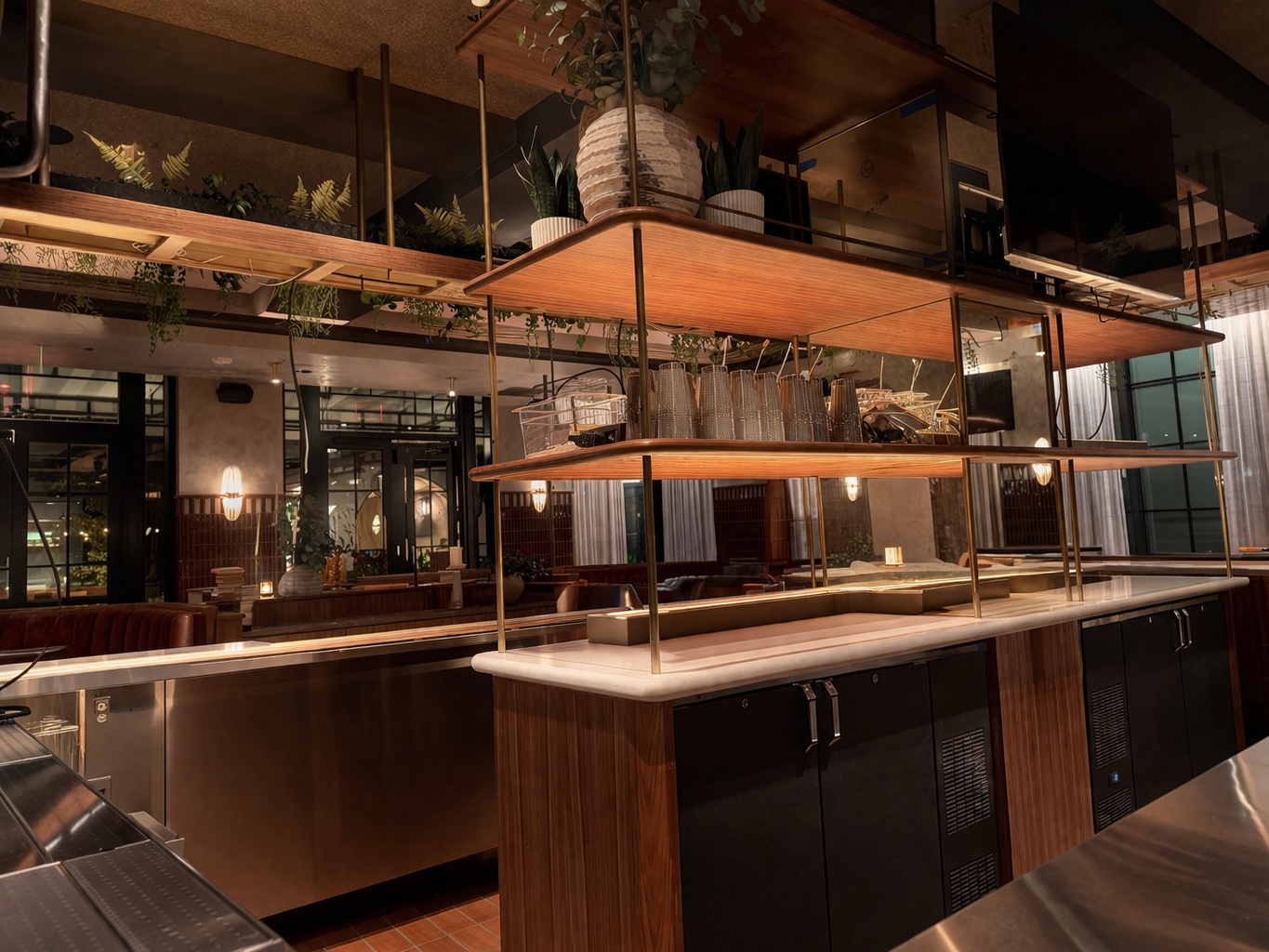 Complete fabrication and installation of custom millwork, architectural metal elements, and bar structures for a full-service restaurant interior.