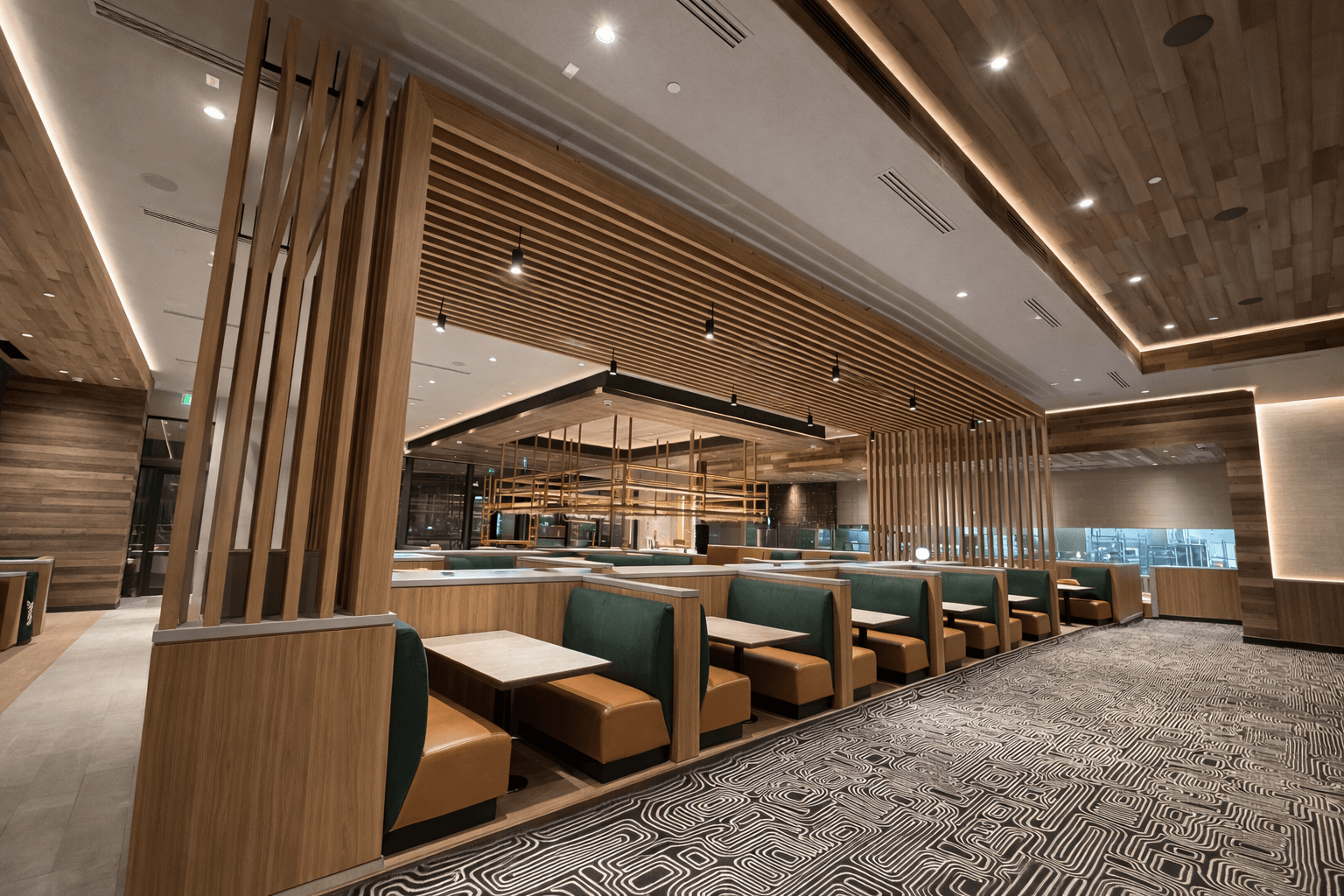 Complete fabrication and installation of custom banquettes, bar shelving, architectural wood elements, and aluminum panels with wood-finished surfaces, designed specifically for a high-end restaurant environment.